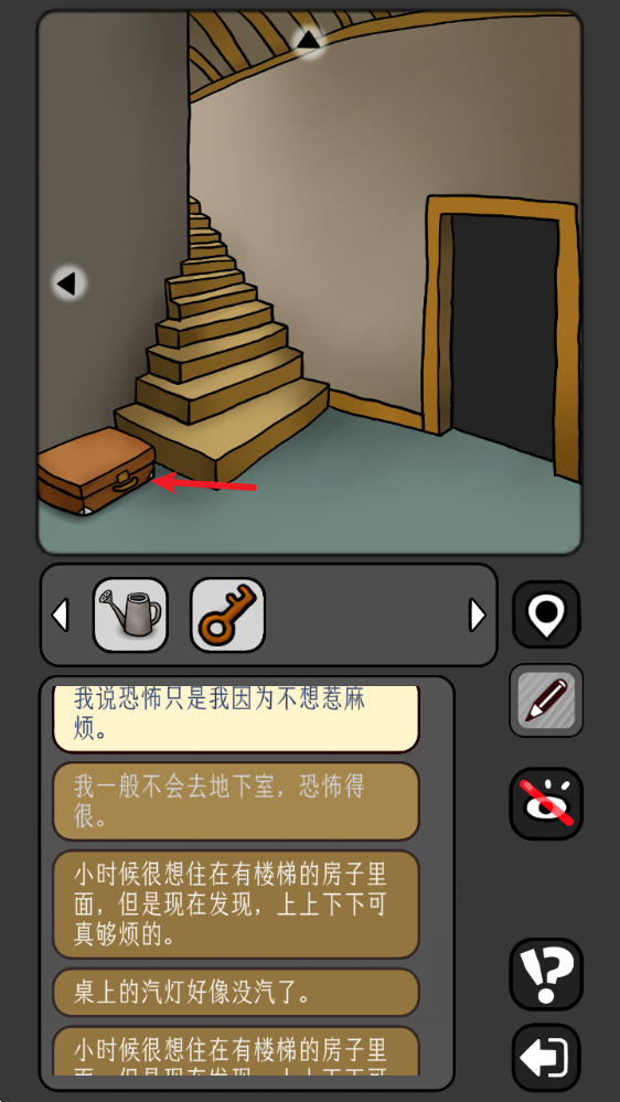 6、回到地下室,点击角落的行李箱,用【钥匙】打开,获得【斧头】和【汽油】。注意纸条上的箭头及纸张折角的位置:左上-下、右上-左、中-上、左下-左、右下-右。